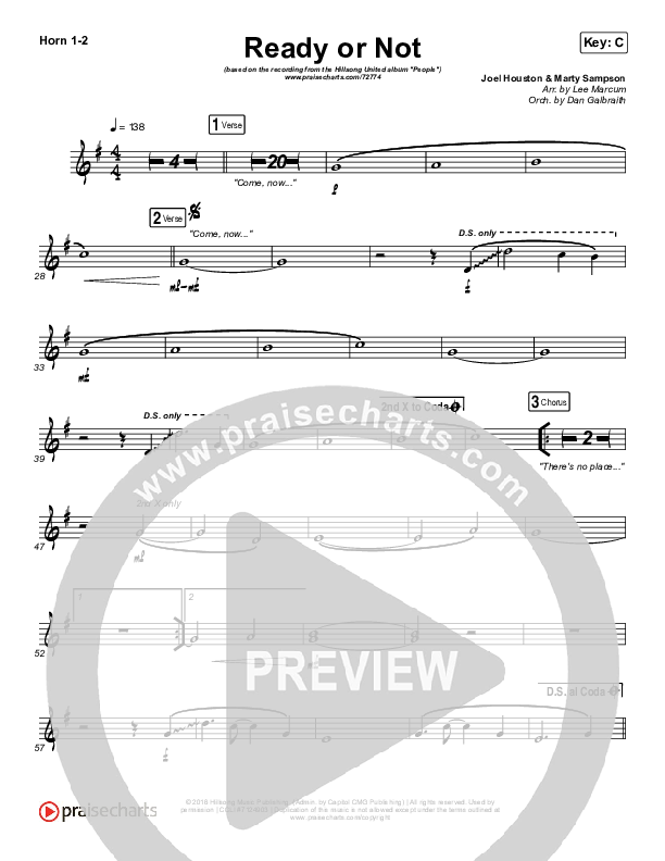 Download the Orchestration brass parts for Ready Or Not by Hillsong UNITED, from the album People. This song was arranged by Lee Marcum / Daniel Galbraith in the key of Bb, C.