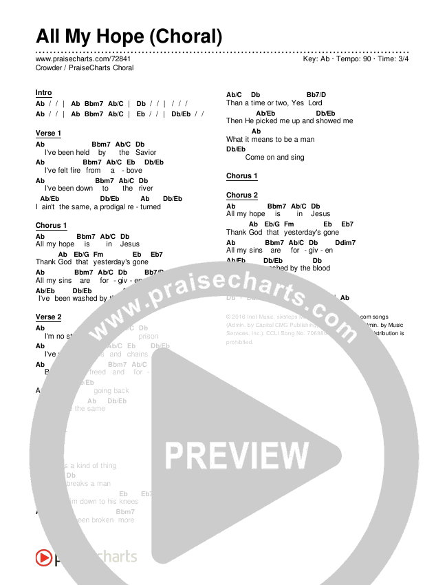 Download the PDF Chord Charts for All My Hope (Choral Anthem SATB) by Crowder / Arr. Luke Gambill, from the album American Prodigal. This song was arranged by Daniel Galbraith / Luke Gambill in the key of Ab.