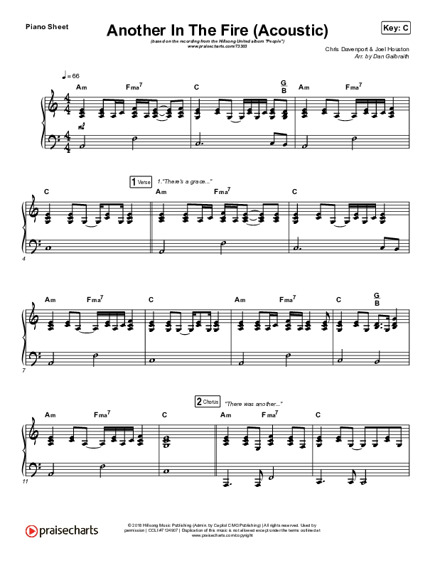 Download the piano sheet for Another In The Fire (Acoustic) by Hillsong UNITED, from the album People. This song was arranged by Daniel Galbraith in the key of Bb, C.