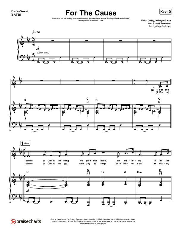 Download the sheet music for For The Cause by Keith & Kristyn Getty, from the album Facing A Task Unfinished. This song was arranged by Daniel Galbraith in the key of D, Eb.