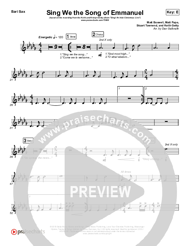 Download the Orchestration wind parts for Sing We The Song Of Emmanuel by Matt Boswell / Matt Papa / Keith & Kristyn Getty, from the album Sing! An Irish Christmas - Live At The Grand Ole Opry House. This song was arranged by Daniel Galbraith in the key of E, Eb.