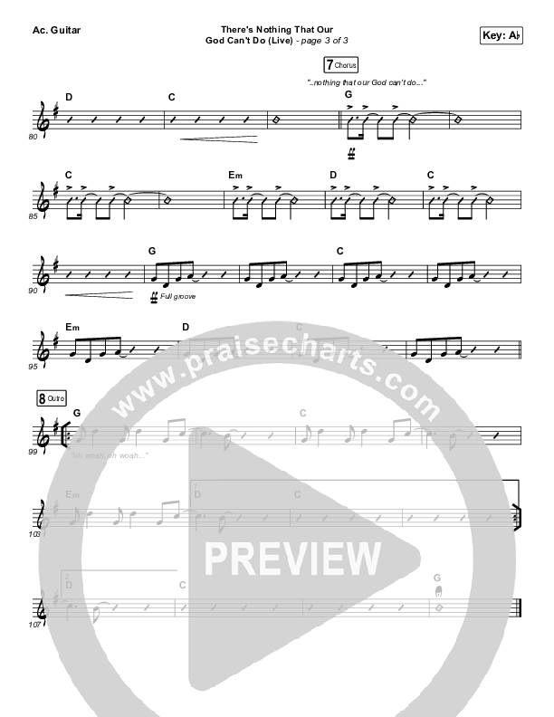 Download the Acoustic Guitar sheet music for There's Nothing That Our God Can't Do (Live) by Passion / Kristian Stanfill, from the album Roar (Live From Passion 2020). This song was arranged by Daniel Galbraith in the key of Ab, D, E, Eb, F, G.
