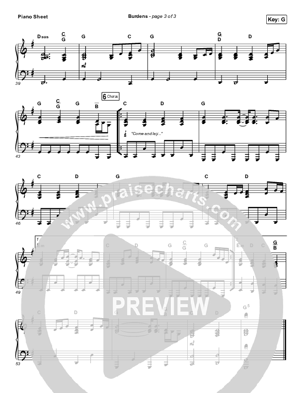 Download the piano sheet for Burdens by Jamie Kimmett, from the album Burdens. This song was arranged by Dustin Loehrs / Grant Wall / Daniel Galbraith in the key of F, G.