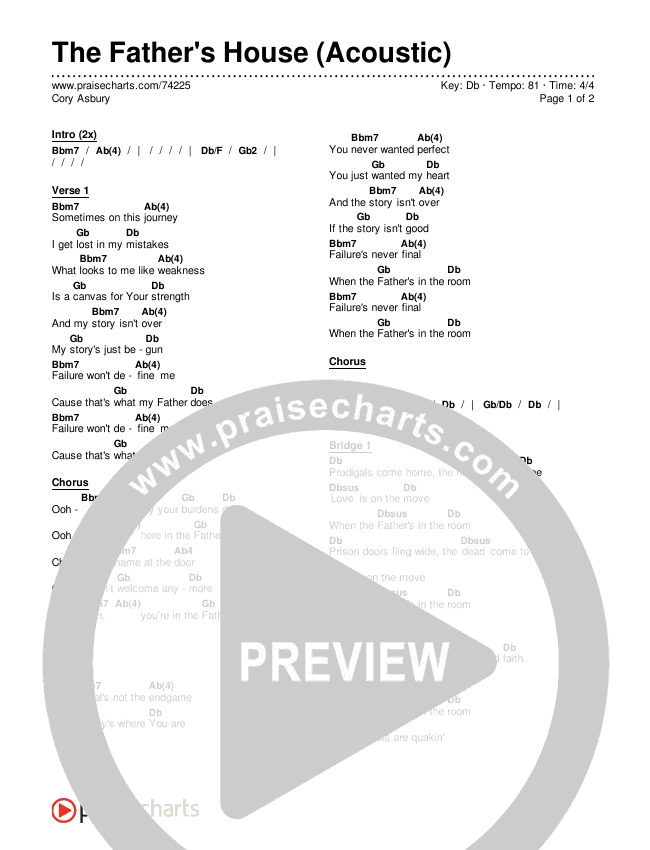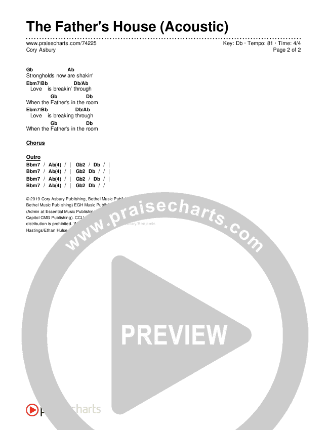 Download the PDF Chord Charts for The Father's House (Acoustic) by Cory Asbury, from the album The Father's House - Single. This song was arranged by Grant Wall / Daniel Galbraith in the key of C, Db.