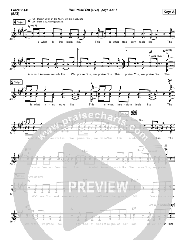 Download the sheet music for We Praise You (Live) by Bethel Music / Brandon Lake, from the album Revival's In The Air. This song was arranged by Dustin Loehrs / Daniel Galbraith in the key of A, Ab, E.