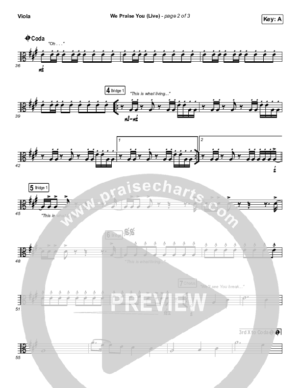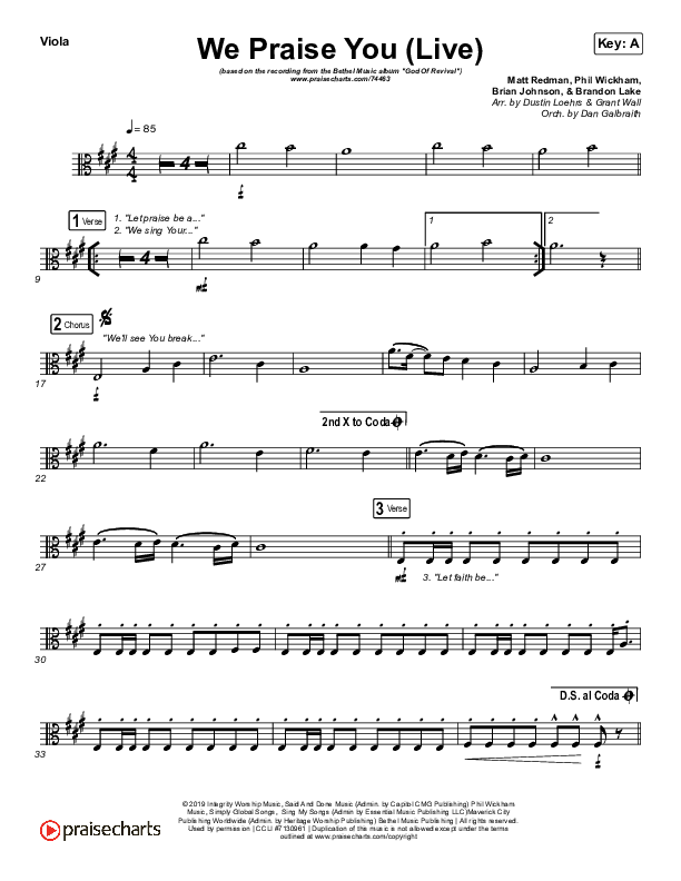 Download the Viola sheet music for We Praise You (Live) by Bethel Music / Brandon Lake, from the album Revival's In The Air. This song was arranged by Dustin Loehrs / Daniel Galbraith in the key of A, Ab, E.