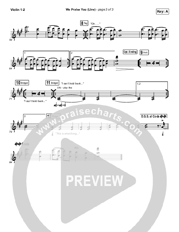 Download the Violin sheet music for We Praise You (Live) by Bethel Music / Brandon Lake, from the album Revival's In The Air. This song was arranged by Dustin Loehrs / Daniel Galbraith in the key of A, Ab, E.