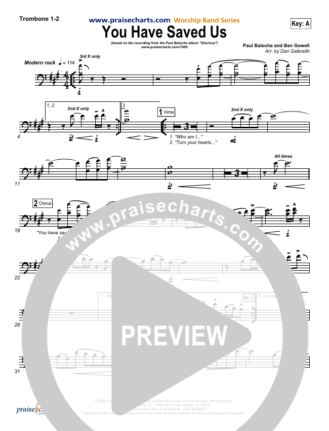 Download the Orchestration brass parts for You Have Saved Us by Paul Baloche, from the album Glorious. This song was arranged by Daniel Galbraith in the key of A, G.