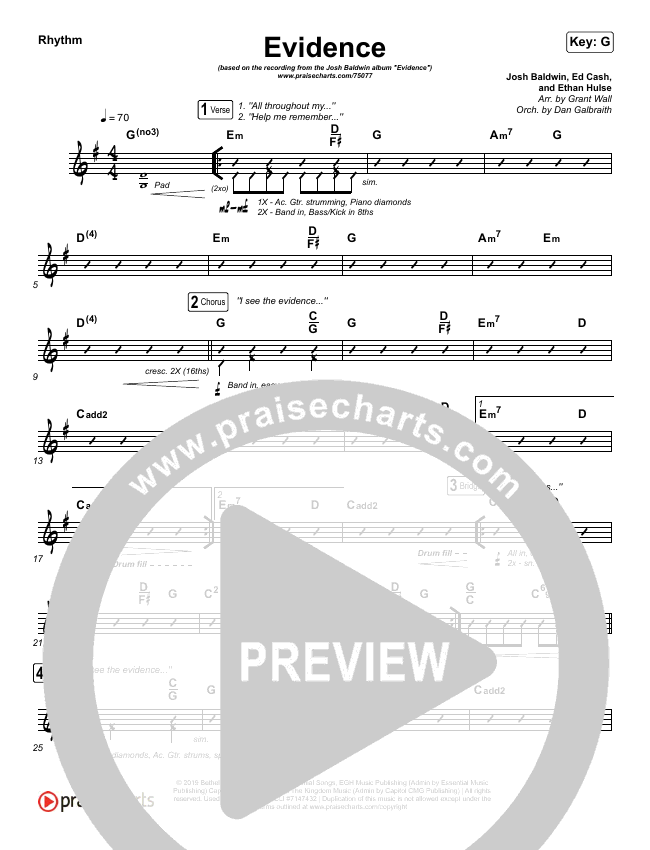 Download the Rhythm Chart for Evidence by Josh Baldwin, from the album Evidence. This song was arranged by Grant Wall / Daniel Galbraith in the key of F, G.
