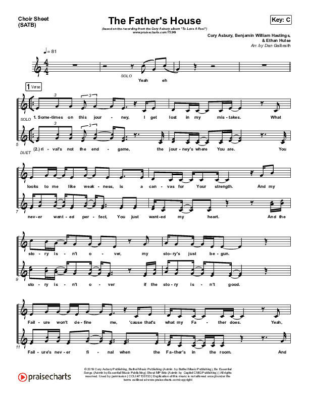 Download the Choir Sheet for The Father's House by Cory Asbury, from the album To Love A Fool. This song was arranged by Daniel Galbraith in the key of C, Db.