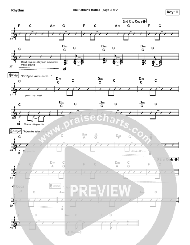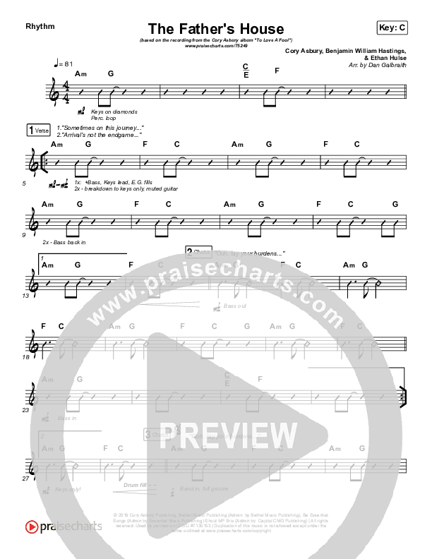 Download the Rhythm Chart for The Father's House by Cory Asbury, from the album To Love A Fool. This song was arranged by Daniel Galbraith in the key of C, Db.
