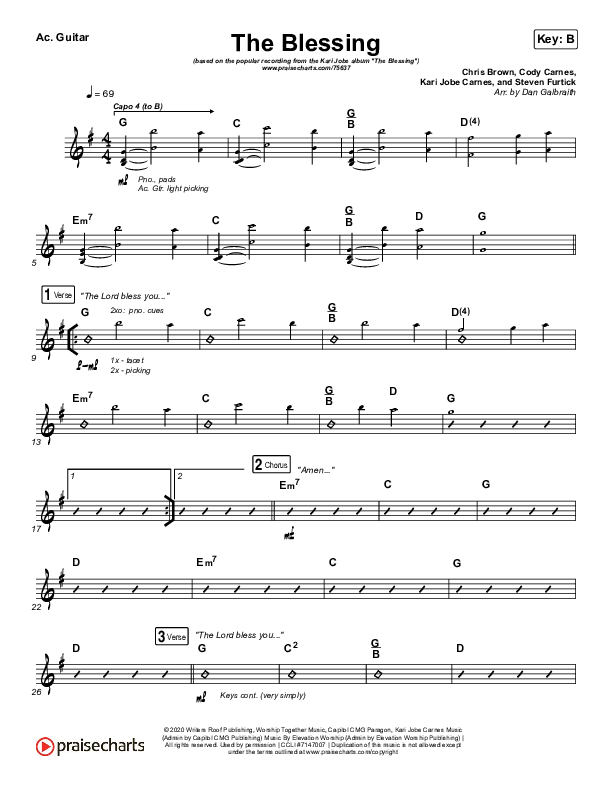 Download the Acoustic Guitar sheet music for The Blessing by Kari Jobe / Cody Carnes, from the album The Blessing. This song was arranged by Daniel Galbraith in the key of A, B, Bb.