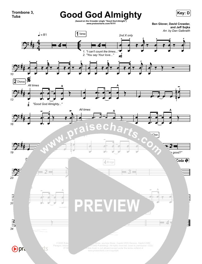 Download the Orchestration brass parts for Good God Almighty by Crowder, from the album Milk & Honey. This song was arranged by Daniel Galbraith in the key of C, D.