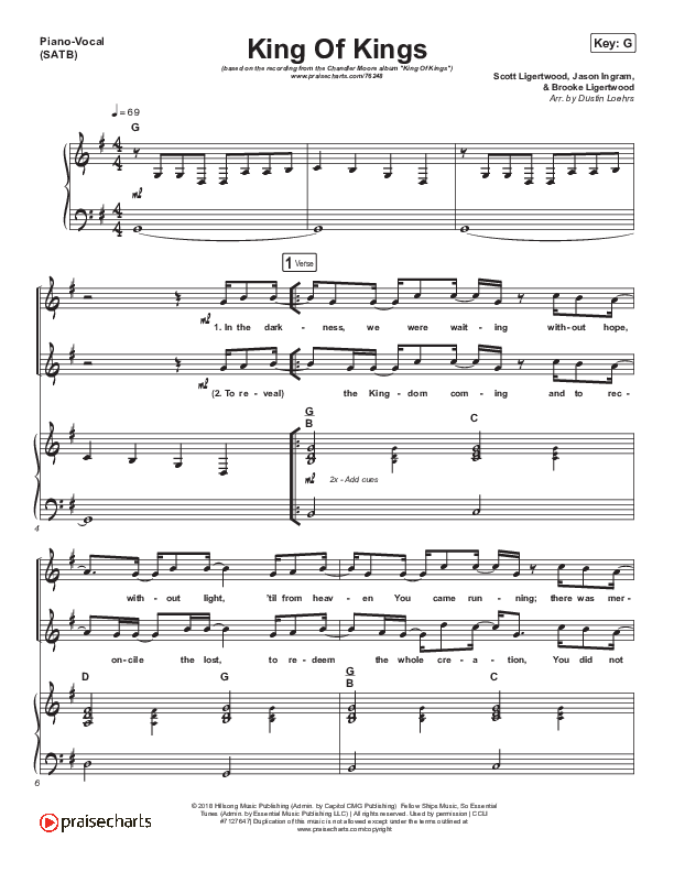 Download the sheet music for King Of Kings by Chandler Moore, from the album King Of Kings. This song was arranged by Dustin Loehrs in the key of G, Gb.