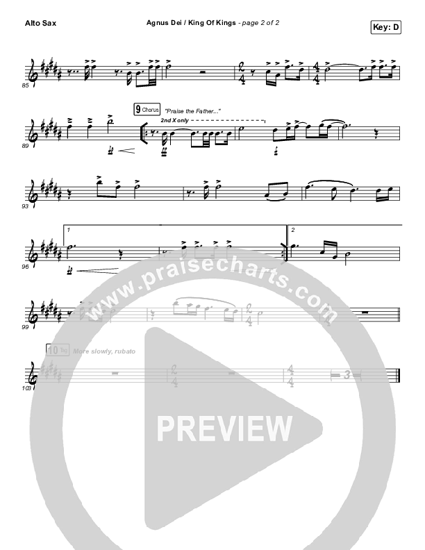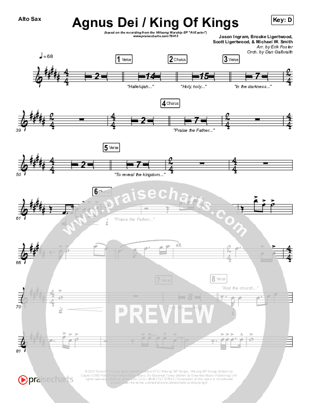 Download the AltoSax sheet music for Agnus Dei / King Of Kings by Hillsong Worship / Chidima / Passion / Jenn Johnson / Brooke Ligertwood, from the album At Easter. This song was arranged by Erik Foster / Daniel Galbraith in the key of D, Eb.