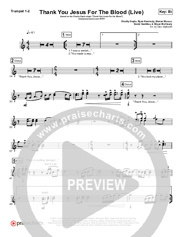Download the Orchestration brass parts for Thank You Jesus For The Blood by Charity Gayle, from the album Endless Praise. This song was arranged by Daniel Galbraith in the key of A, Bb, C.