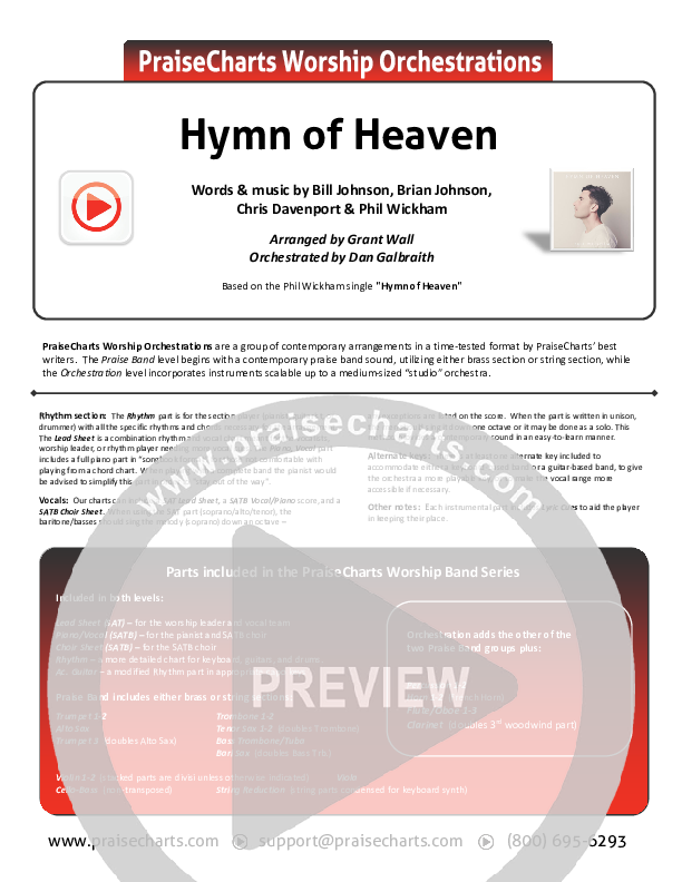 Download the Orchestration for Hymn Of Heaven by Phil Wickham, from the album Hymn Of Heaven. This song was arranged by Grant Wall / Daniel Galbraith in the key of C, D, E, Eb.