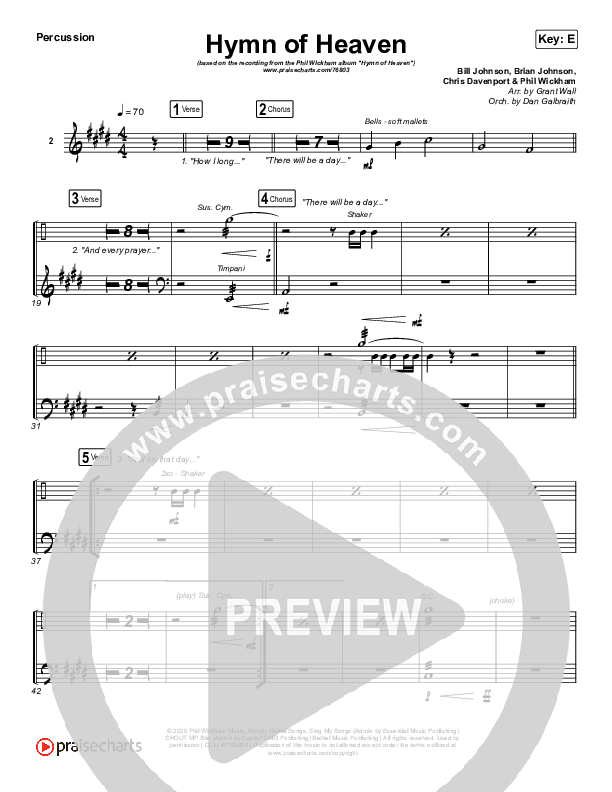 Download the percussion sheet music for Hymn Of Heaven by Phil Wickham, from the album Hymn Of Heaven. This song was arranged by Grant Wall / Daniel Galbraith in the key of C, D, E, Eb.