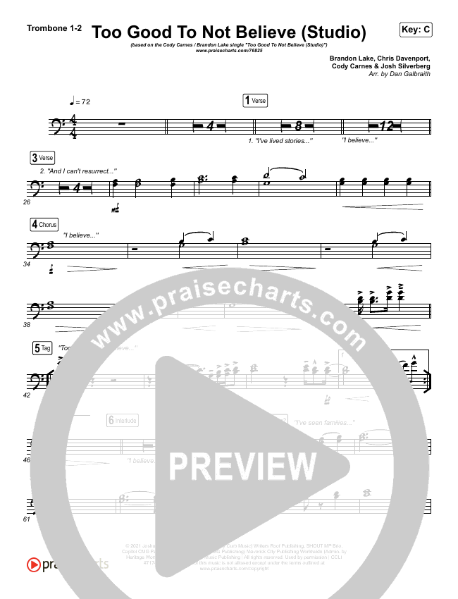 Download the Orchestration brass parts for Too Good To Not Believe (Studio) by Cody Carnes / Brandon Lake, from the album Too Good To Not Believe. This song was arranged by Daniel Galbraith in the key of Bb, C.