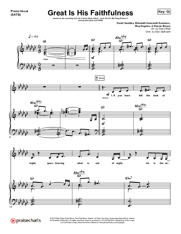 Download the sheet music for Great Is His Faithfulness by Charity Gayle, from the album Lord You Are My Song (Deluxe). This song was arranged by Grant Wall / Daniel Galbraith in the key of G, Gb.