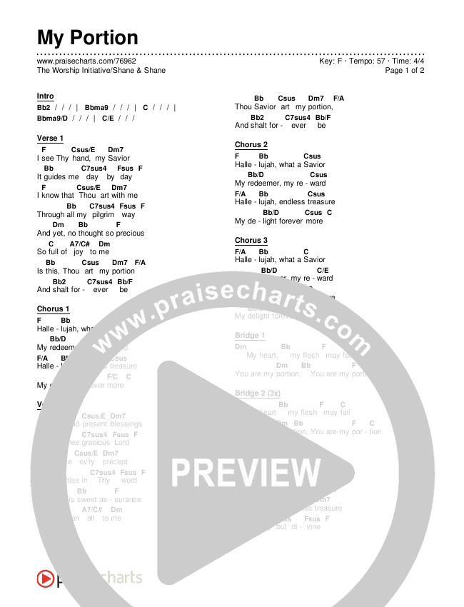 Download the PDF Chord Charts for My Portion by The Worship Initiative / Shane & Shane, from the album Psalms Hymns And Spiritual Songs Vol 1. This song was arranged by Grant Wall in the key of E, F.
