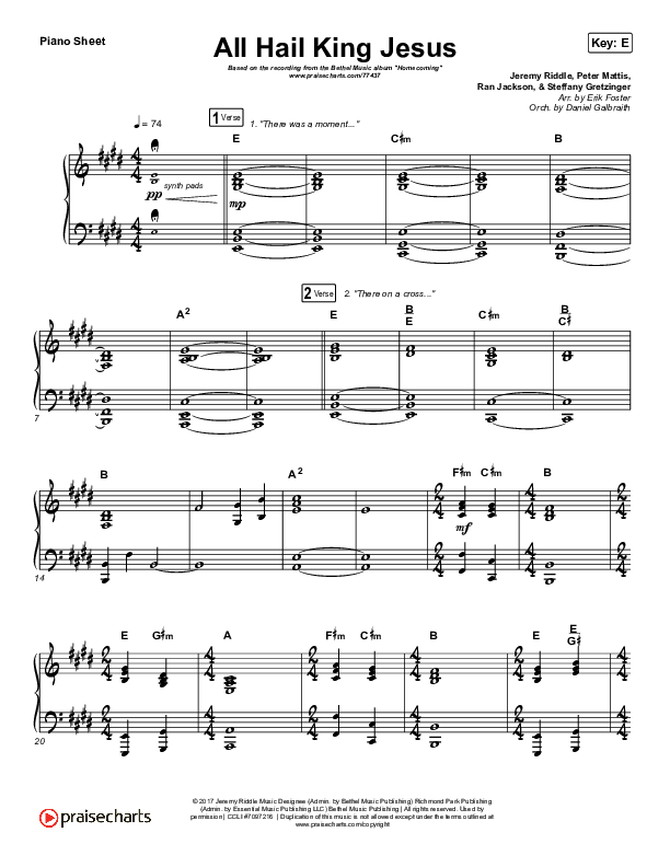 Download the Orchestration for All Hail King Jesus (Live) by Bethel Music / Bethany Wohrle, from the album Homecoming. This song was arranged by Erik Foster / Daniel Galbraith in the key of B, C, D, E, Eb, F, G.