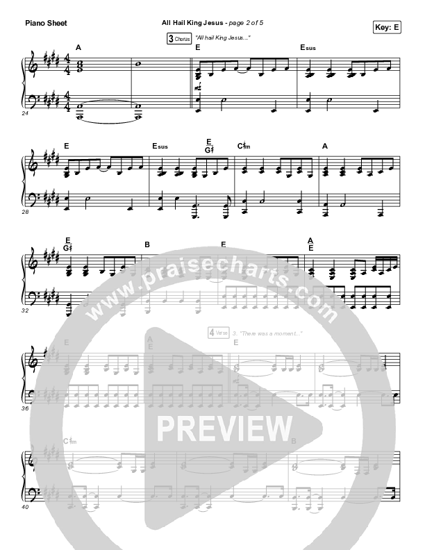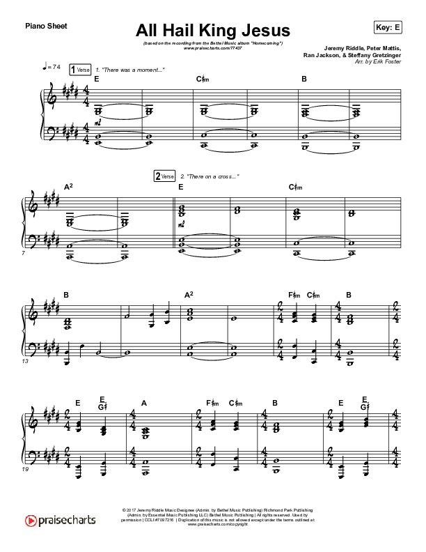 Download the piano sheet for All Hail King Jesus (Live) by Bethel Music / Bethany Wohrle, from the album Homecoming. This song was arranged by Erik Foster / Daniel Galbraith in the key of B, C, D, E, Eb, F, G.
