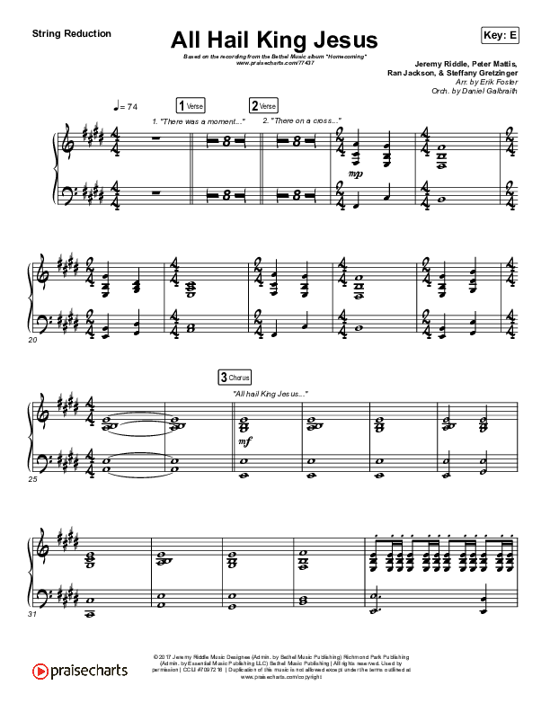 Download the String Reduction sheet music for All Hail King Jesus (Live) by Bethel Music / Bethany Wohrle, from the album Homecoming. This song was arranged by Erik Foster / Daniel Galbraith in the key of B, C, D, E, Eb, F, G.
