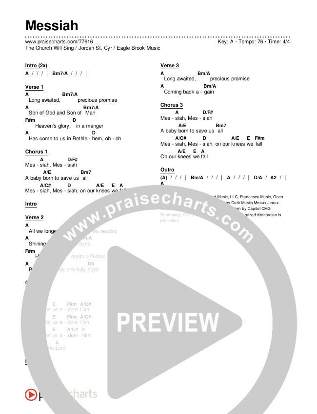 Download the PDF Chord Charts for Messiah by The Church Will Sing / Jordan St. Cyr / Eagle Brook Music, from the album Messiah.