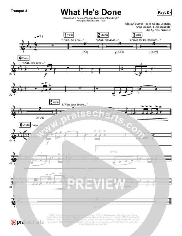 Download the trumpet sheet music for What He's Done (Studio) by Passion / Kristian Stanfill / Tasha Cobbs Leonard / Anna Golden, from the album Burn Bright (Studio EP). This song was arranged by Daniel Galbraith in the key of C, D, Db.