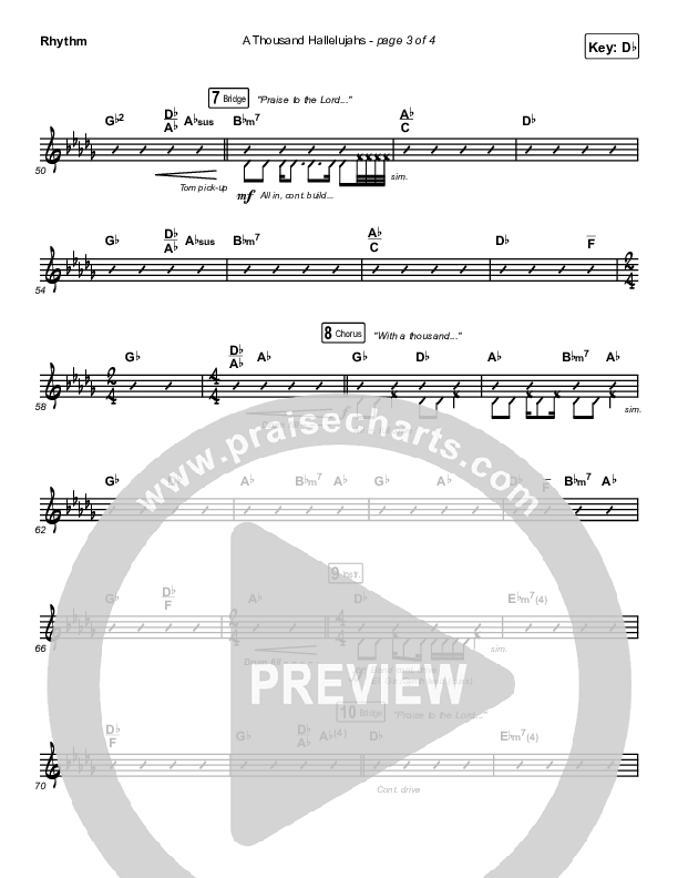 Download the Rhythm Chart for A Thousand Hallelujahs (Live) by Brooke Ligertwood, from the album A Thousand Hallelujahs. This song was arranged by Grant Wall / Daniel Galbraith in the key of C, D, Db.