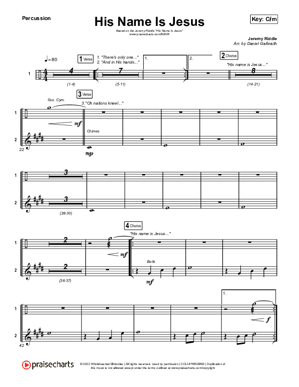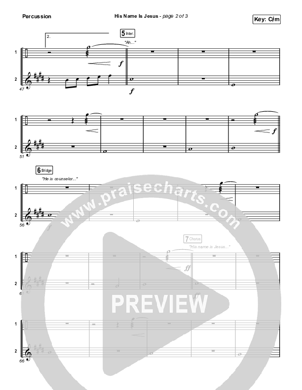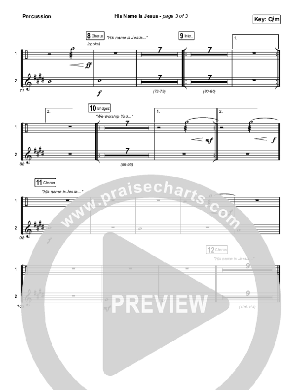 Download the percussion sheet music for His Name Is Jesus by Jeremy Riddle, from the album Live In The Prayer Room. This song was arranged by Daniel Galbraith in the key of C#m, Cm.