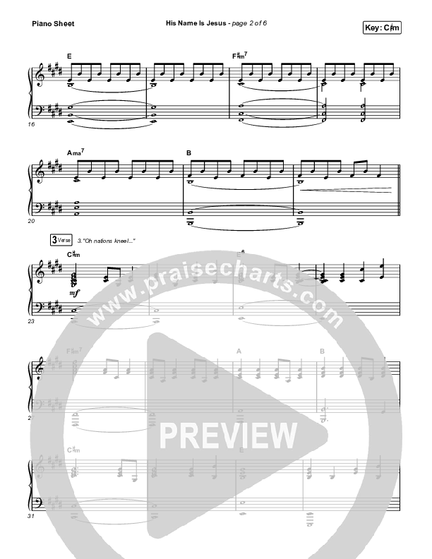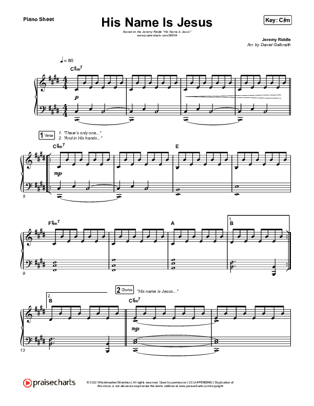 Download the piano sheet for His Name Is Jesus by Jeremy Riddle, from the album Live In The Prayer Room. This song was arranged by Daniel Galbraith in the key of C#m, Cm.