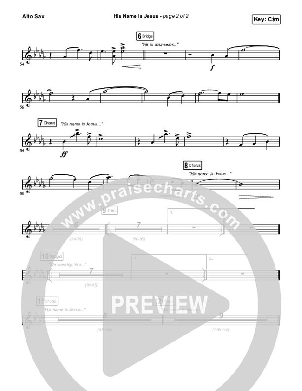 Download the Saxaphone instruments PDF sheet music for His Name Is Jesus by Jeremy Riddle, from the album Live In The Prayer Room. This song was arranged by Daniel Galbraith in the key of C#m, Cm.
