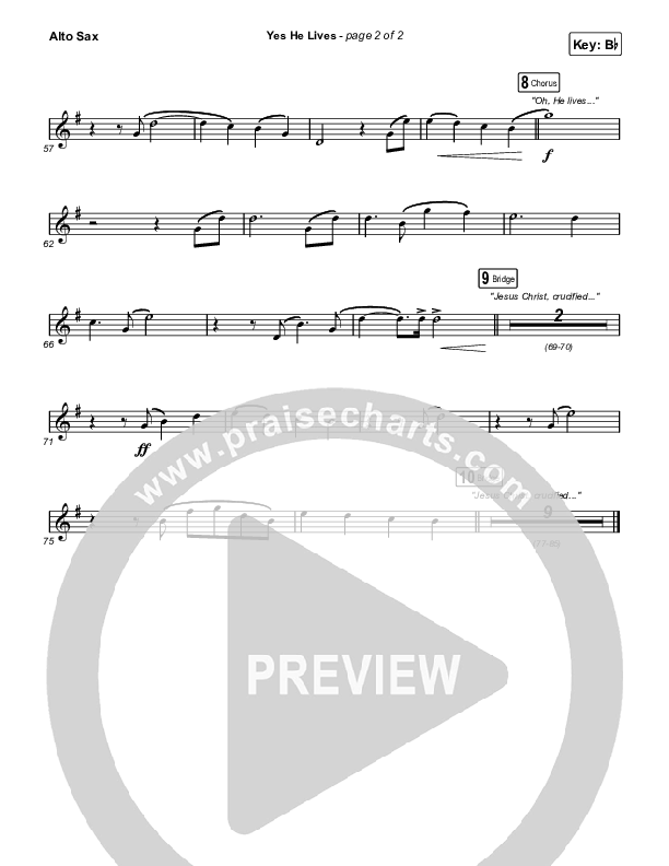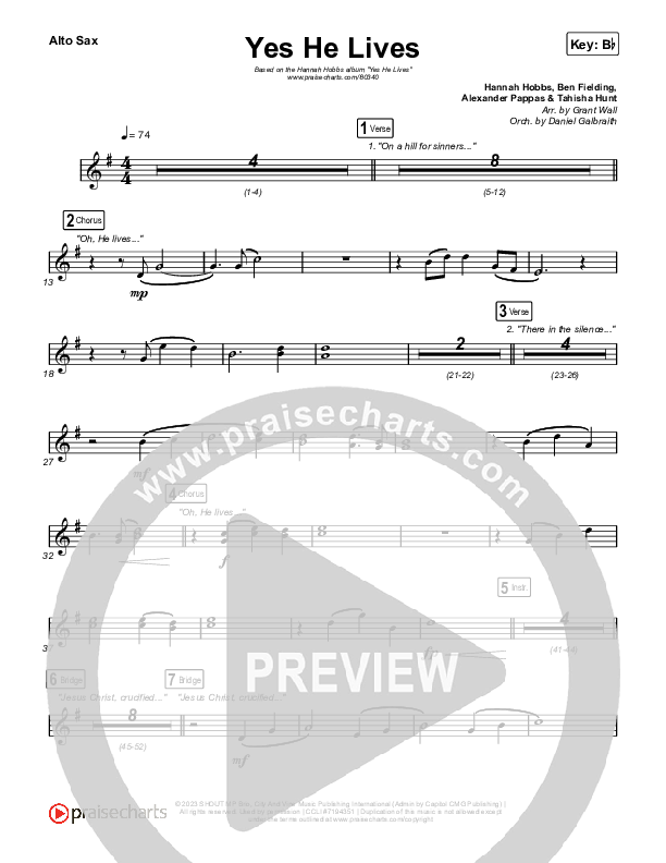 Download the Alto Sax 1,2 sheet music for Yes He Lives by Hannah Hobbs, from the album Sundown. This song was arranged by Daniel Galbraith / Grant Wall in the key of Bb, C.