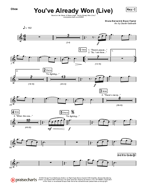 Download the Oboe sheet music for You've Already Won (Live) by Shane & Shane, from the album You've Already Won (Live). This song was arranged by Daniel Galbraith in the key of Bb, C, D, Db.