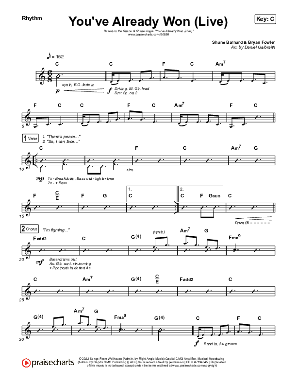 Download the Rhythm Chart for You've Already Won (Live) by Shane & Shane, from the album You've Already Won (Live). This song was arranged by Daniel Galbraith in the key of Bb, C, D, Db.