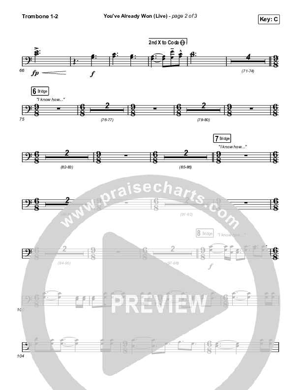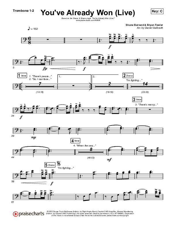 Download the Trombone 1,2 sheet music for You've Already Won (Live) by Shane & Shane, from the album You've Already Won (Live). This song was arranged by Daniel Galbraith in the key of Bb, C, D, Db.