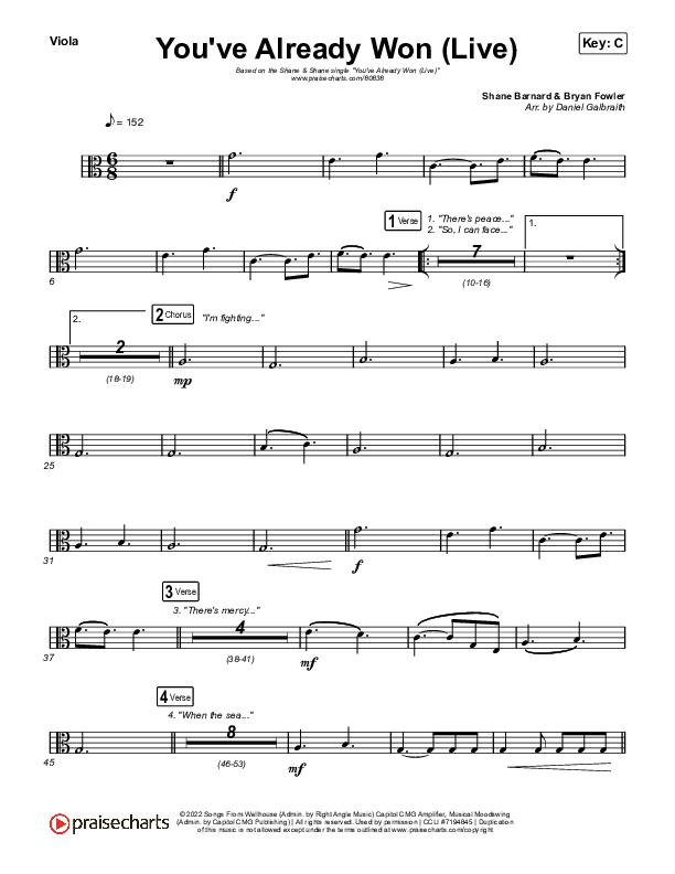 Download the Viola sheet music for You've Already Won (Live) by Shane & Shane, from the album You've Already Won (Live). This song was arranged by Daniel Galbraith in the key of Bb, C, D, Db.