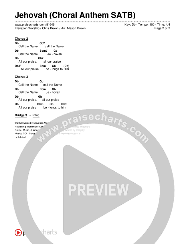 Download the PDF Chord Charts for Jehovah (Choral Anthem SATB) by Elevation Worship / Chris Brown / Arr. Mason Brown, from the album Can You Imagine?. This song was arranged by Mason Brown / Daniel Galbraith in the key of Db.