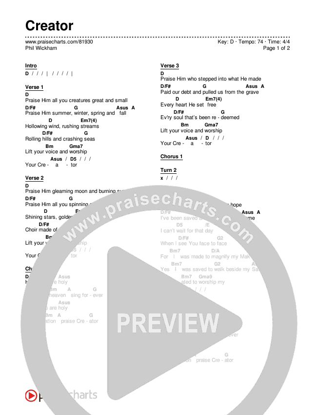 Download the PDF Chord Charts for Creator by Phil Wickham, from the album I Believe. This song was arranged by Daniel Galbraith in the key of C, D.