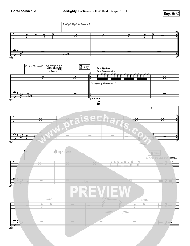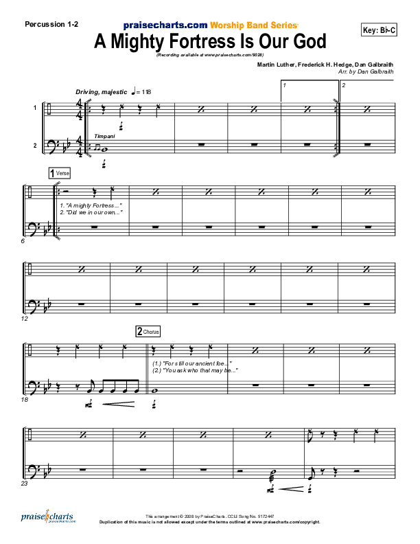 Download the percussion sheet music for A Mighty Fortress Is Our God by PraiseCharts Band / Arr. Daniel Galbraith, from the album Patriotic PraiseHymns. This song was arranged by Daniel Galbraith in the key of Bb, C.