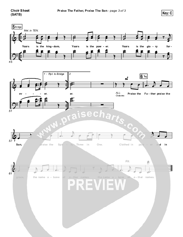 Download the Choir Sheet for Praise The Father Praise The Son by Chris Tomlin, from the album Hello Love. This song was arranged by Daniel Galbraith in the key of C, D, F.