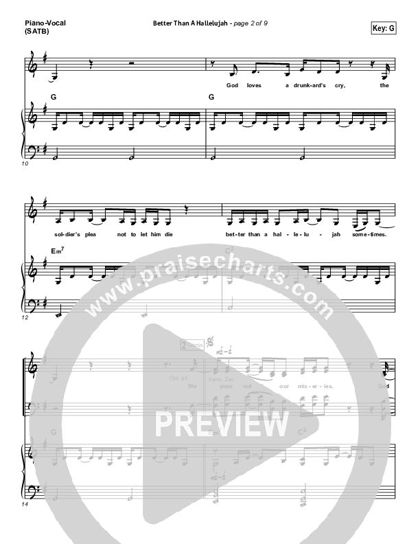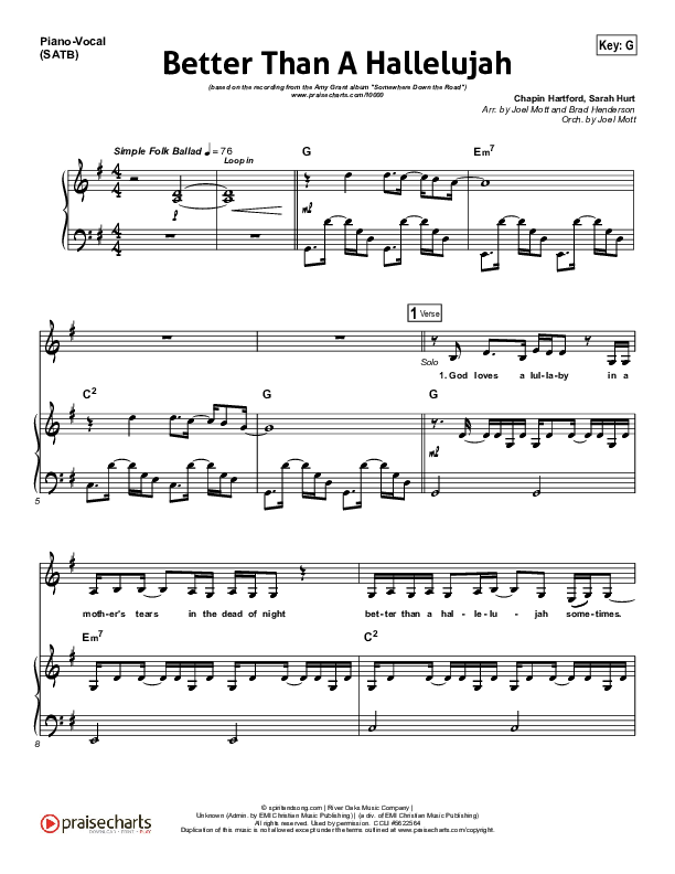 Download the sheet music for Better Than A Hallelujah by Amy Grant, from the album Somewhere Down The Road. This song was arranged by Joel Mott / Brad Henderson in the key of A, G.