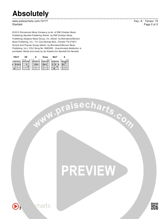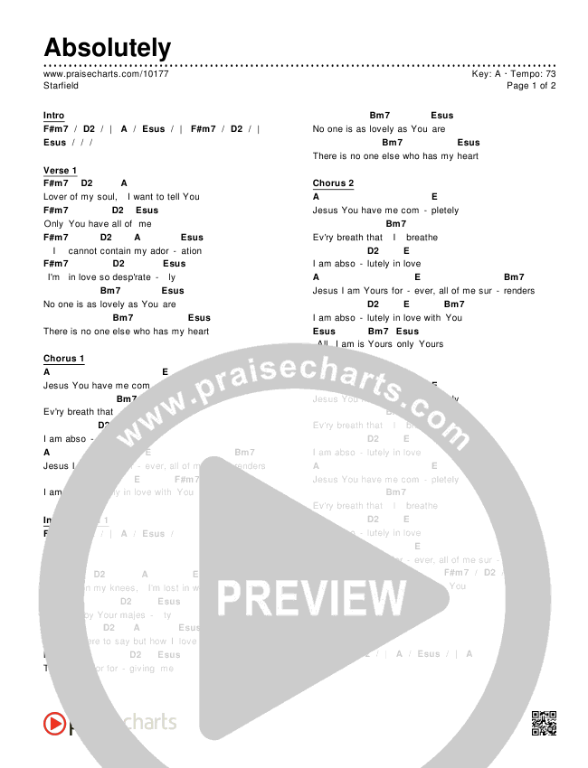 Download the PDF Chord Charts for Absolutely by Starfield, from the album The Saving One. This song was arranged by John Carlson in the key of Bb, E.