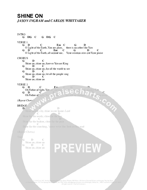 Download the PDF Chord Charts for Shine On by Carlos Whittaker, from the album Ragamuffin Soul. This song was arranged by Integrity Music in the key of .