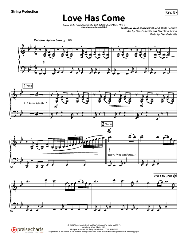 Download the Orchestration for Love Has Come by Mark Schultz, from the album WOW Hits 2011. This song was arranged by Daniel Galbraith / Brad Henderson in the key of Bb, C.