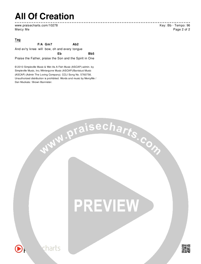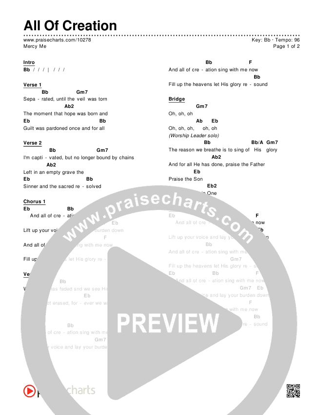 Download the PDF Chord Charts for All Of Creation by MercyMe, from the album The Generous Mr. Lovewell. This song was arranged by Joel Mott in the key of Bb, G.