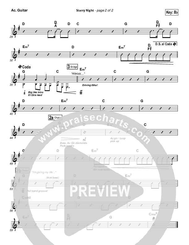 Download the Acoustic Guitar sheet music for Starry Night by Chris August, from the album No Far Away. This song was arranged by Joel Mott / Brad Henderson in the key of Bb, C.