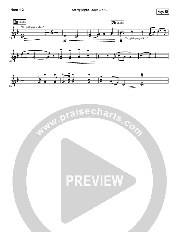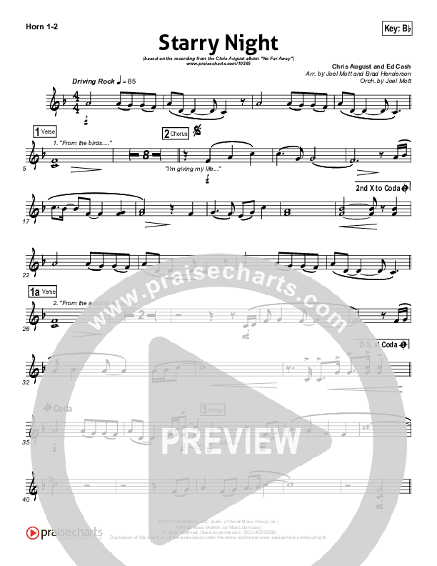 Download the French Horn sheet music for Starry Night by Chris August, from the album No Far Away. This song was arranged by Joel Mott / Brad Henderson in the key of Bb, C.